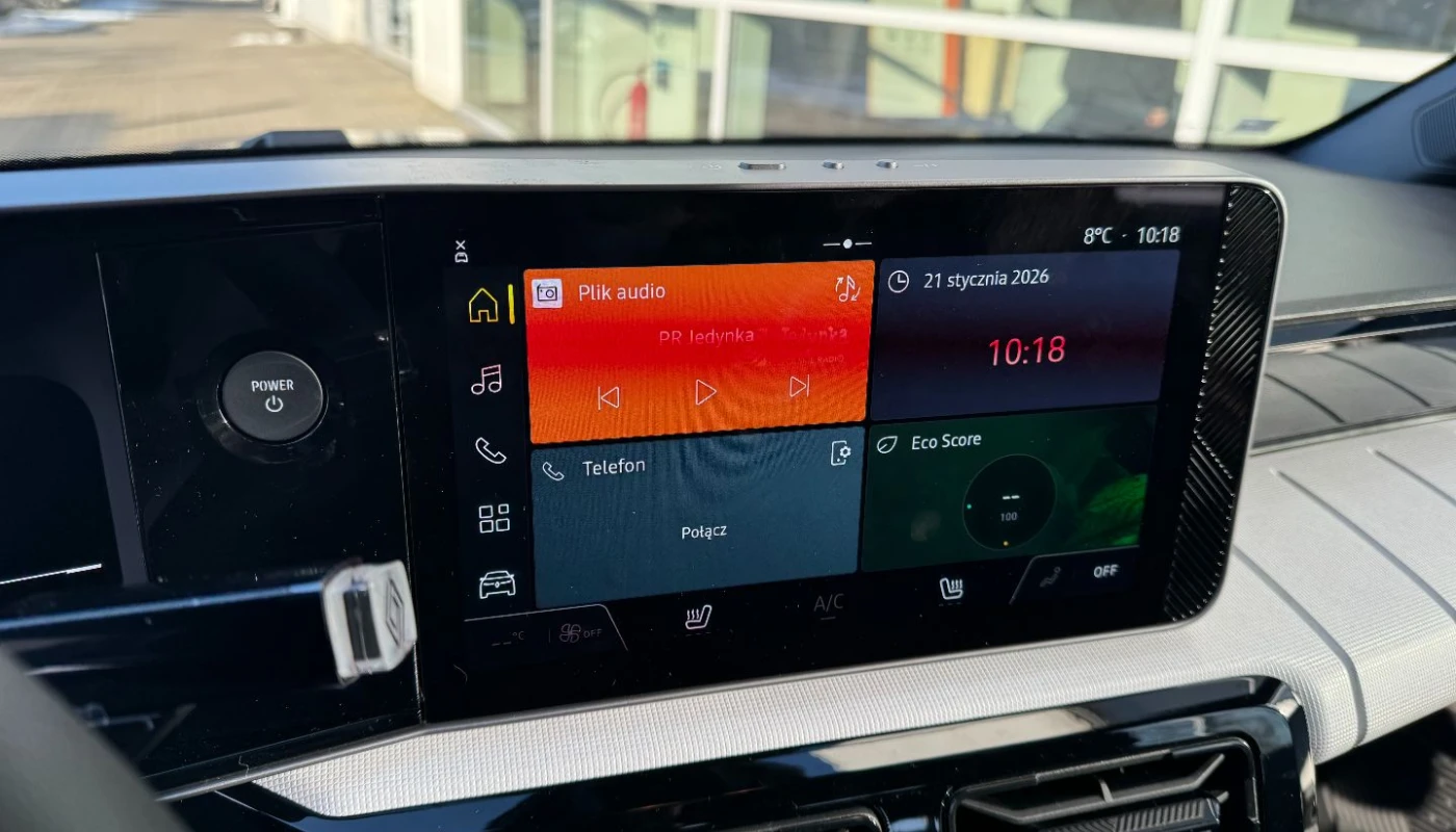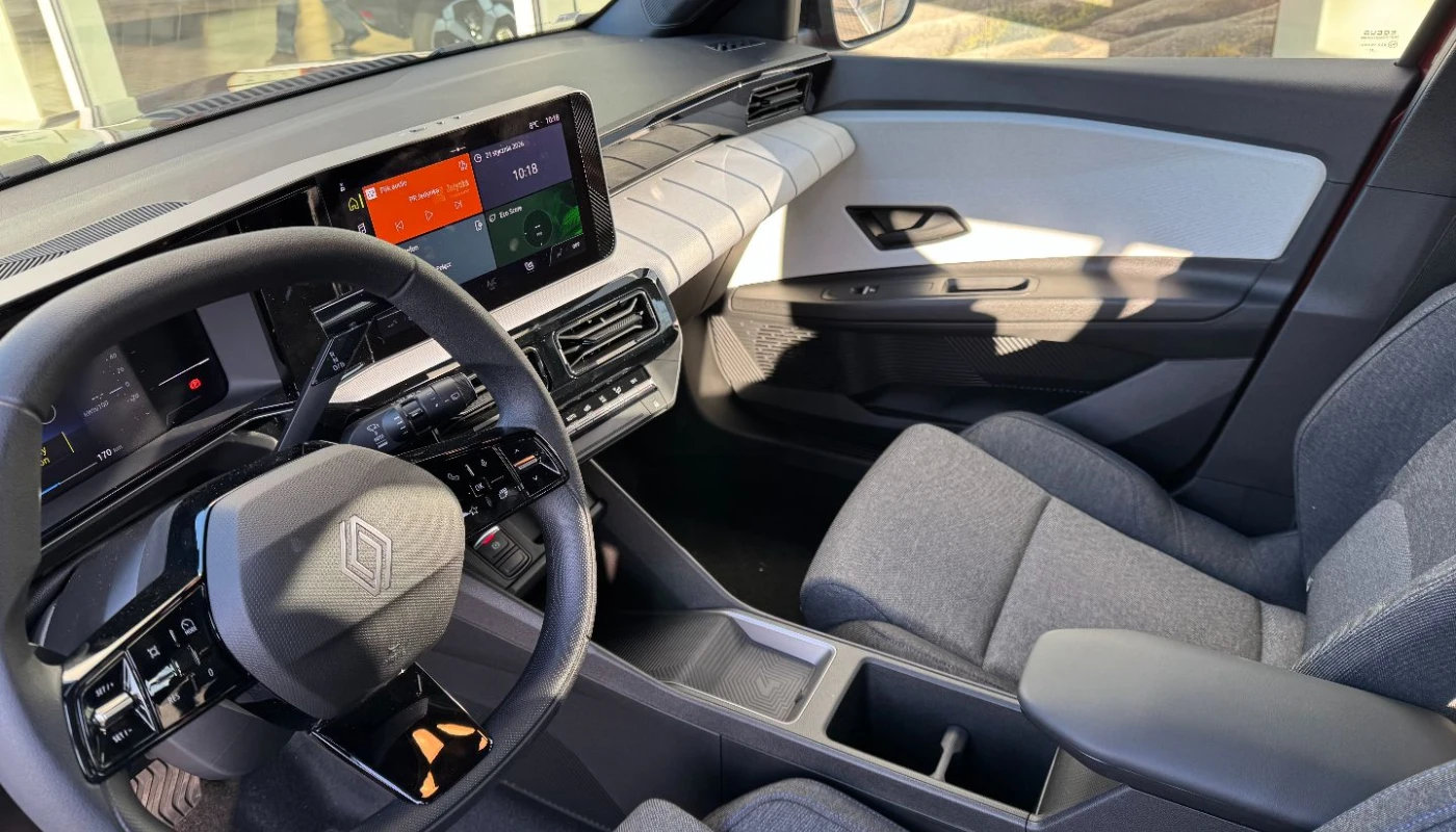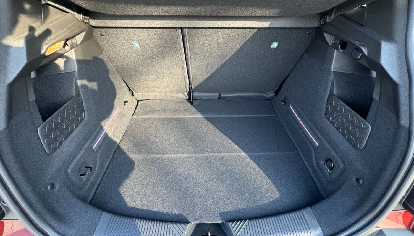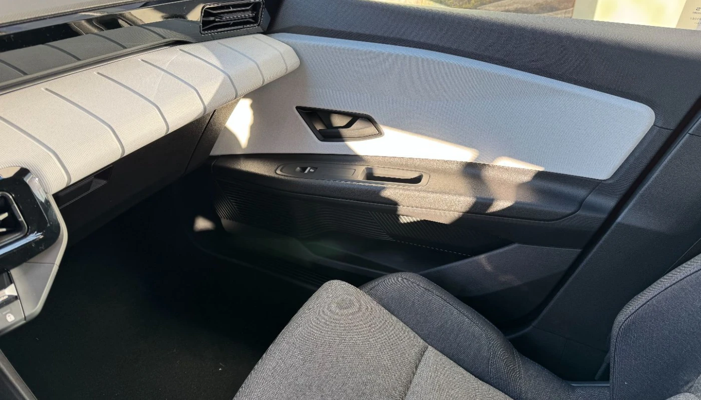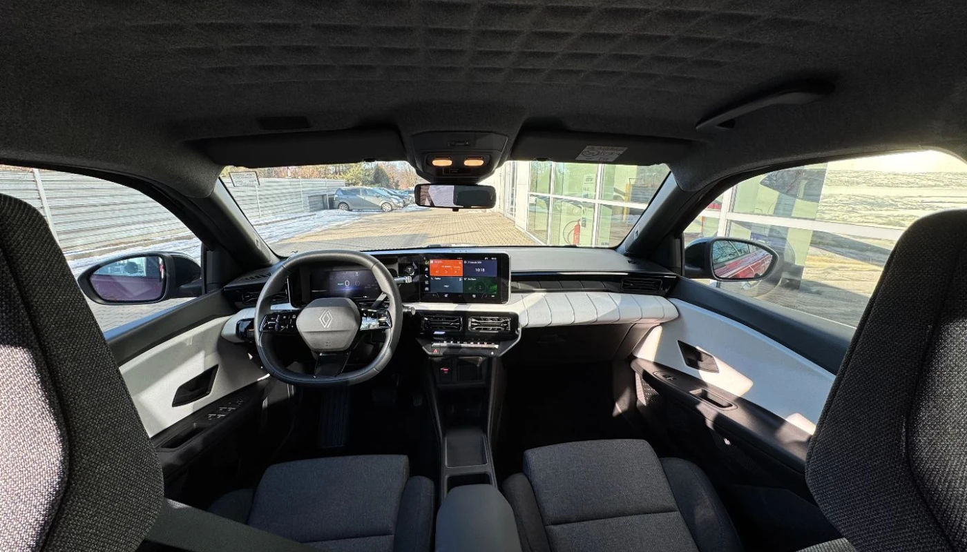 - ciemna tonacja wnętrza, jasne wykończenie deski rozdzielczej, pikowana tapicerka materiałowa w kolorze szarym z przeszyciami w kolorach francuskiej flagi