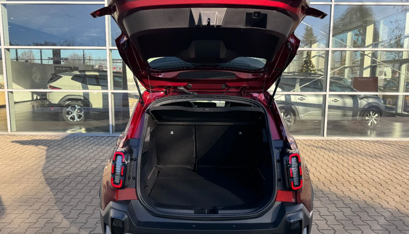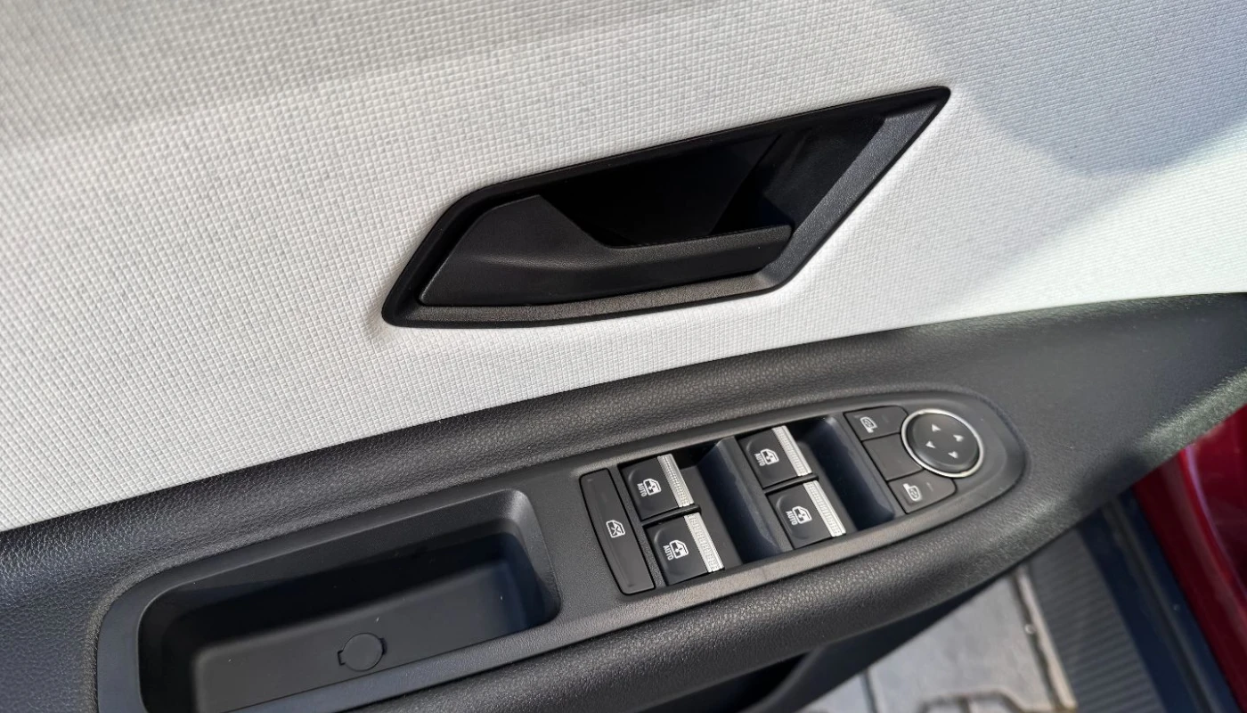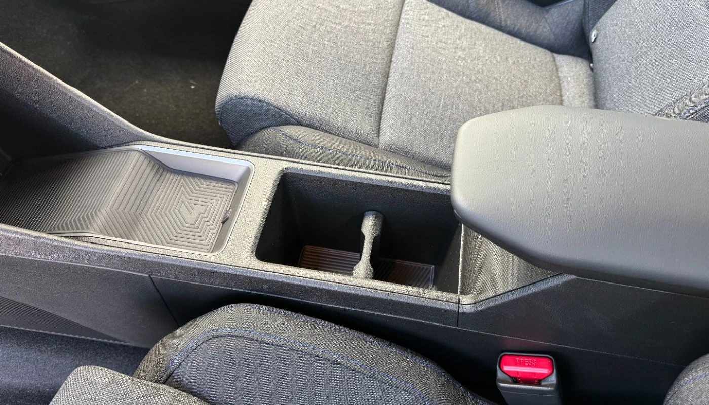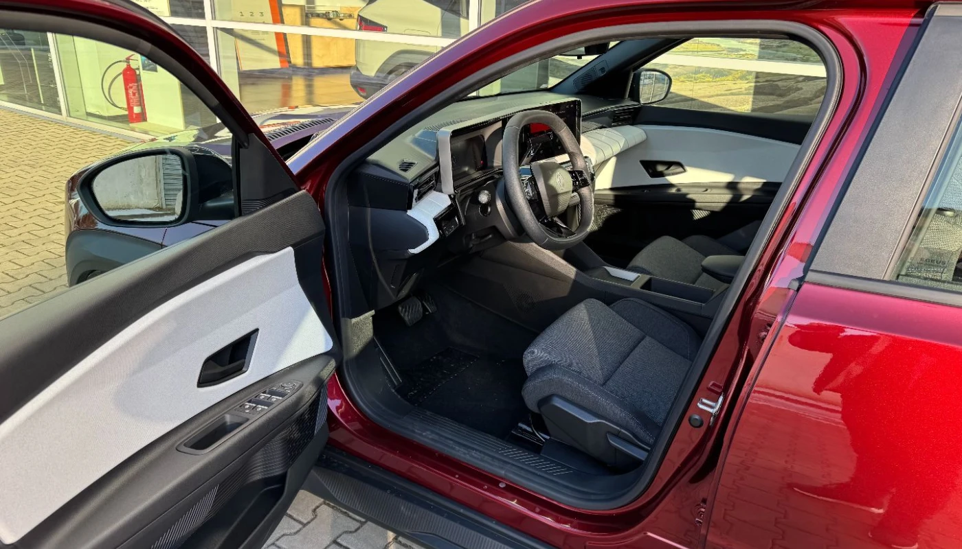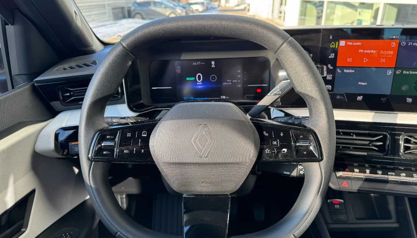 - ciemna tonacja wnętrza, jasne wykończenie deski rozdzielczej, pikowana tapicerka materiałowa w kolorze szarym z przeszyciami w kolorach francuskiej flagi
